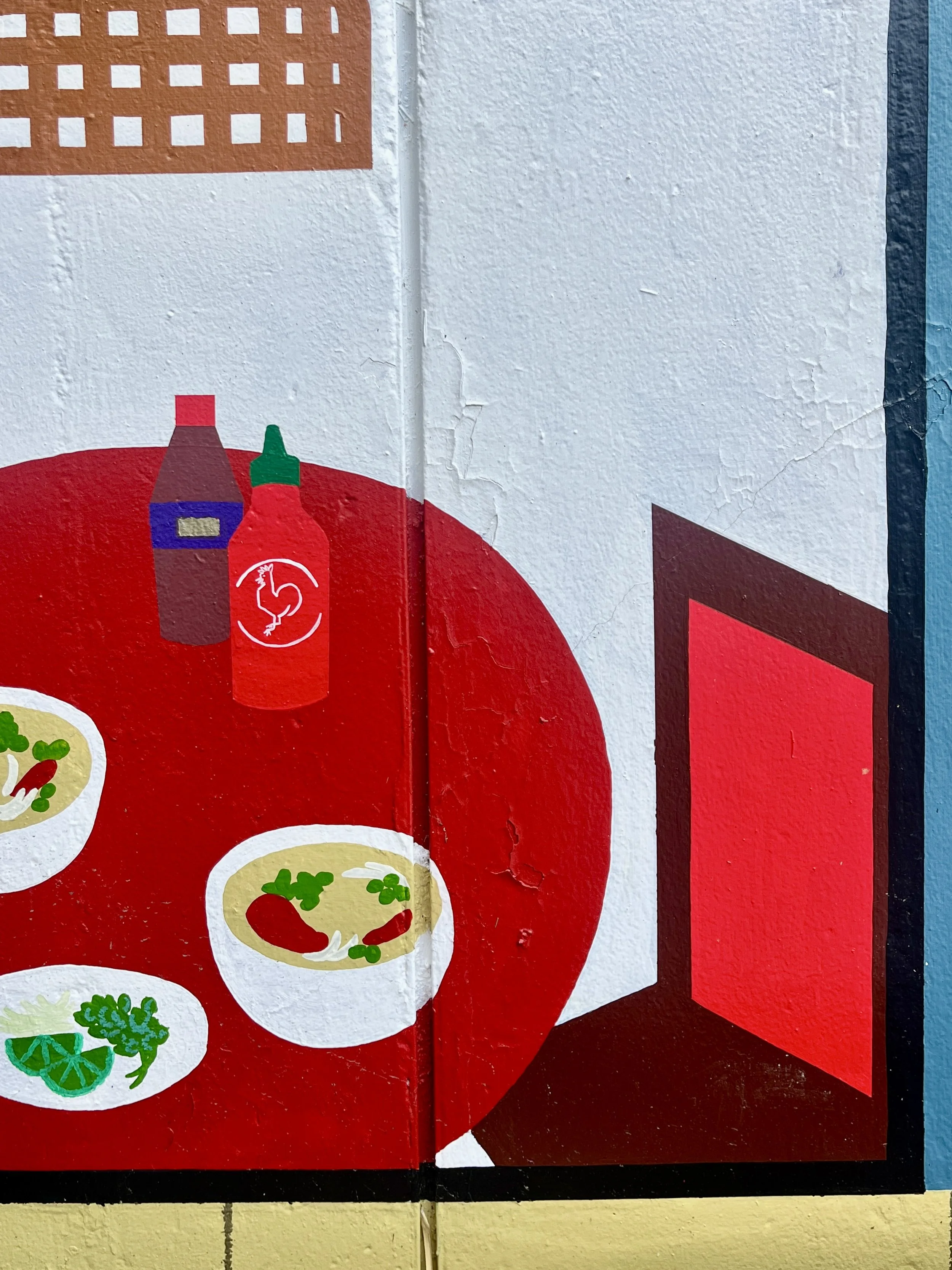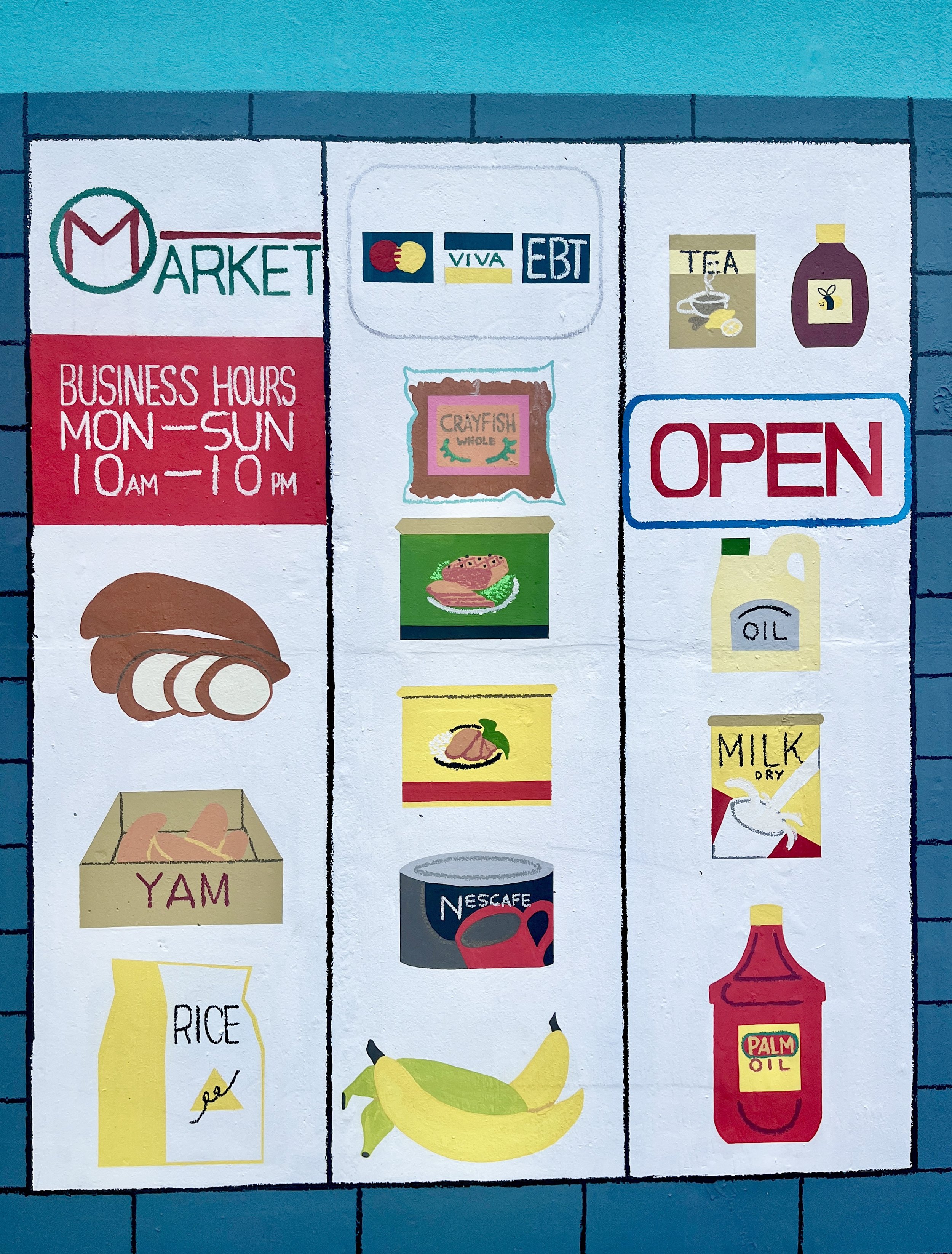 Mural on wall with paint + wax pastel, 31 x 8.5 feet