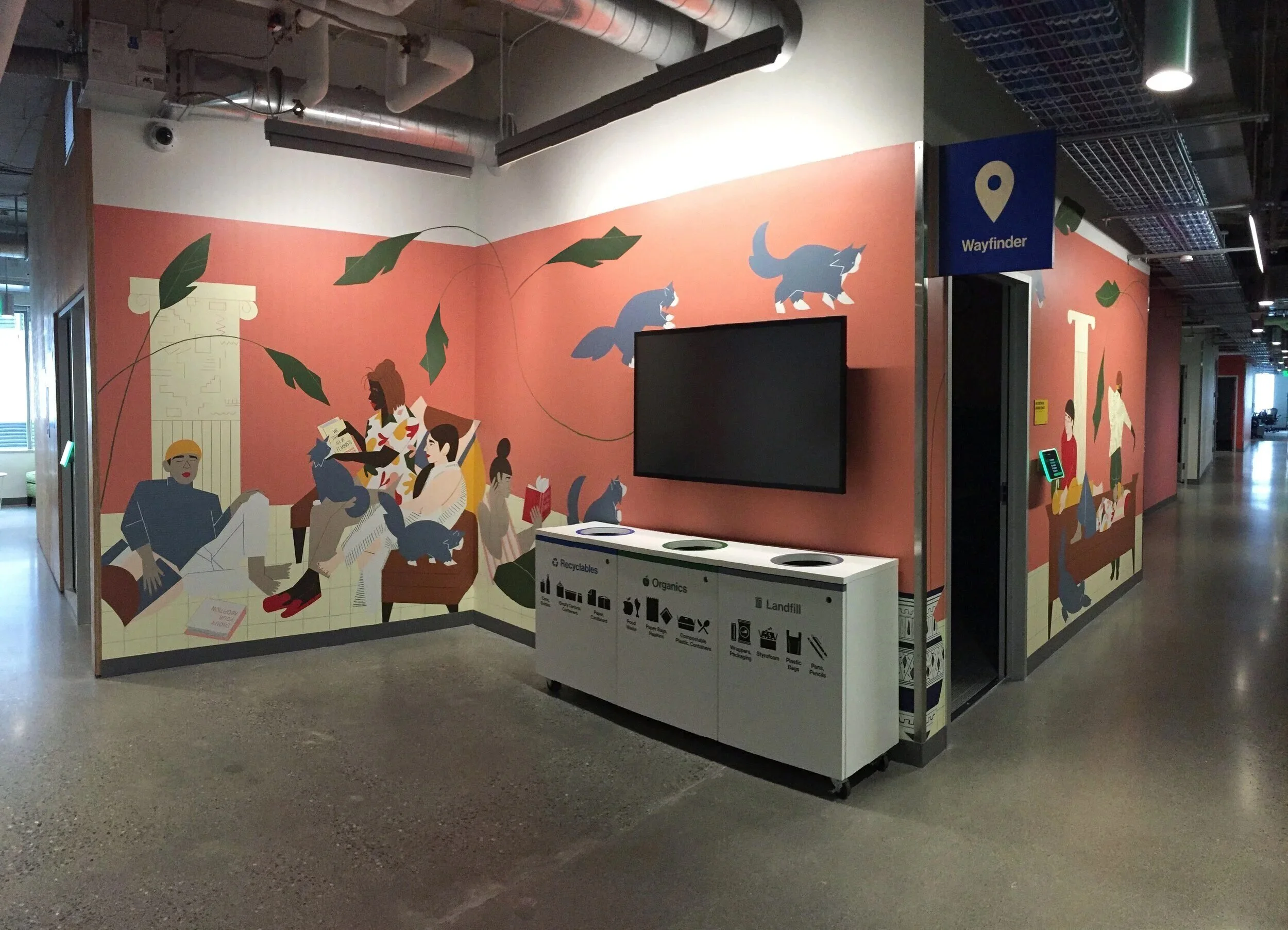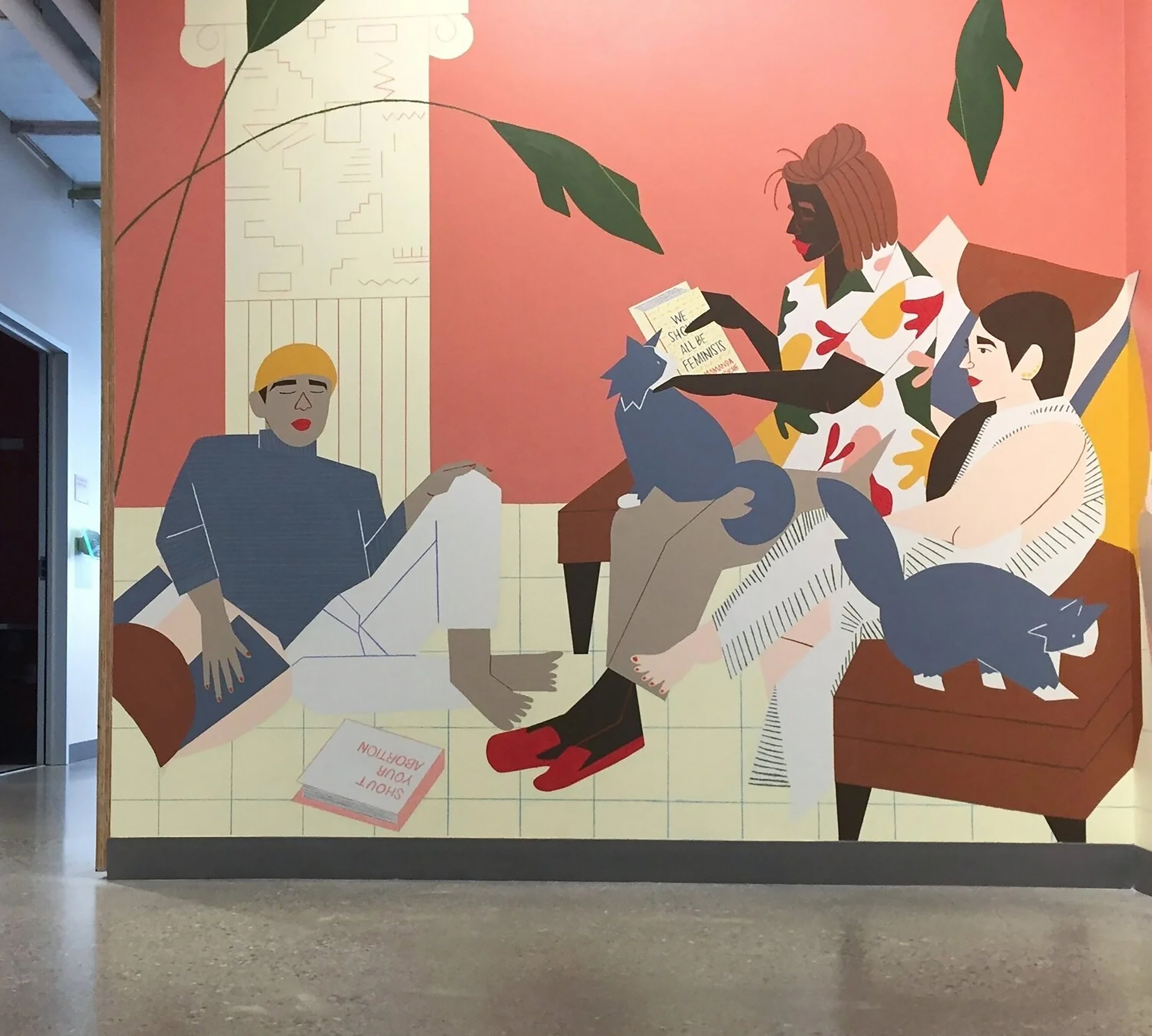 For this mural I envisioned a scene full of quiet moments, where the viewers could share in that calm while amid a bustling work environment. My aim is to capture the tenderness, familiarity, and intimacy experienced in this world, through selective simplicity and narrative details. Some of the softer details or objects may be overlooked at first, though as the viewer spends more time with the piece details previously hidden reveal themselves. These objects are intended to create connection between the viewer and environment through repeated interaction over the course of their daily life. Just as the objects in our homes become a meaningful backdrop to our lives, this mural is meant to reflect a similarly meaningful, supportive and inspiring physical space.